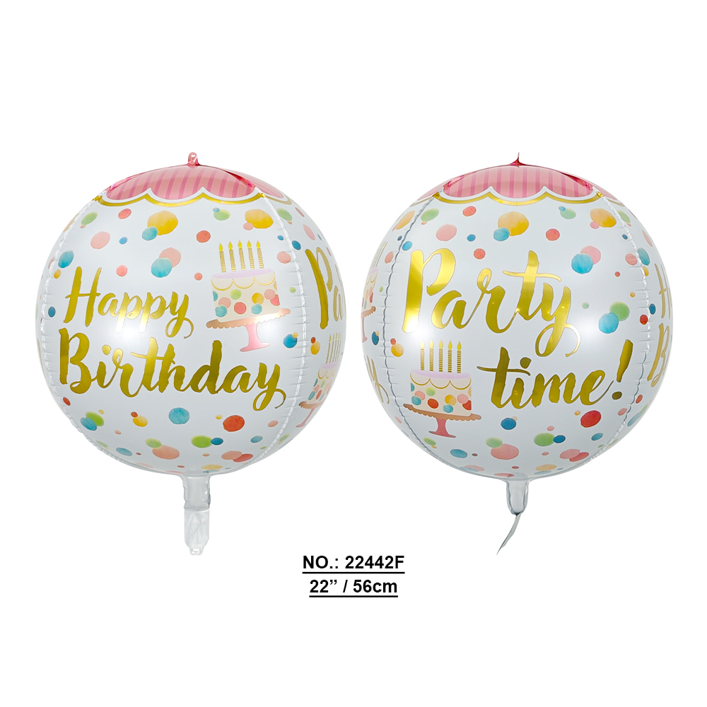 Helium / AirMake every birthday celebration shine with our 4D Birthday Foil Balloon. Designed in a full 3D sphere shape, this balloon shows different festive prints on the front and back — “Happy Birthday” on one side and “Party Time!” on the other. With a diameter of 22 inches (56 cm), it floats beautifully when filled with helium and makes a perfect decoration for birthdays, parties, and events.