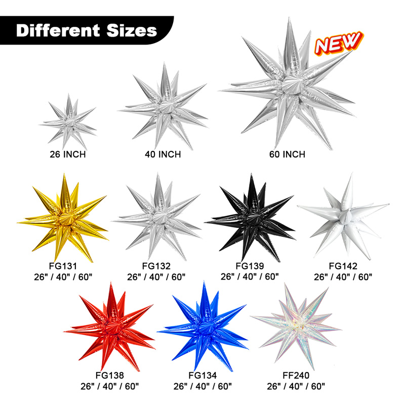 AirMake a bold statement with our Black Starburst Foil Balloons, now available in three impactful sizes: 26 inch, 40 inch, and the newly added 60 inch. Each balloon is created by combining 12 separate star-shaped foil segments, forming a stunning 3D starburst centerpiece ideal for luxury events and visual merchandising.