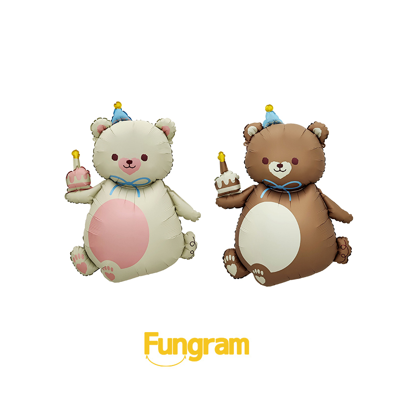 Air / HeliumFungram as a professional wholesale foil balloons supplier and foil birthday balloons manufacturer, we craft each balloon with premium, durable foil material that ensures long-lasting inflation and vibrant, fade-resistant colors. The charming design features two cuddly bears—one in soft cream with a pink belly, and the other in rich brown with a white belly—both wearing party hats and holding sweet treats, making them ideal foil birthday party decorations balloons.